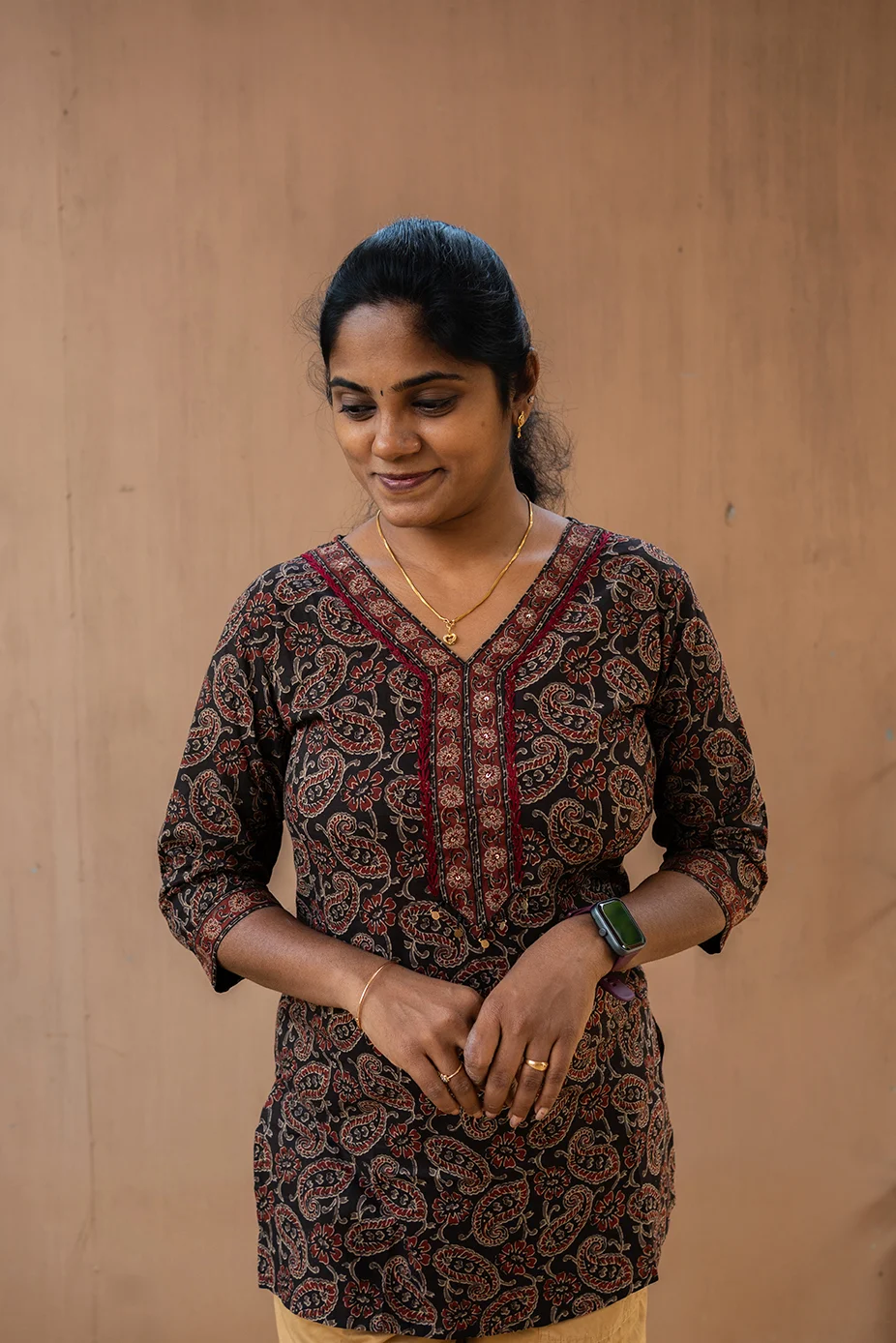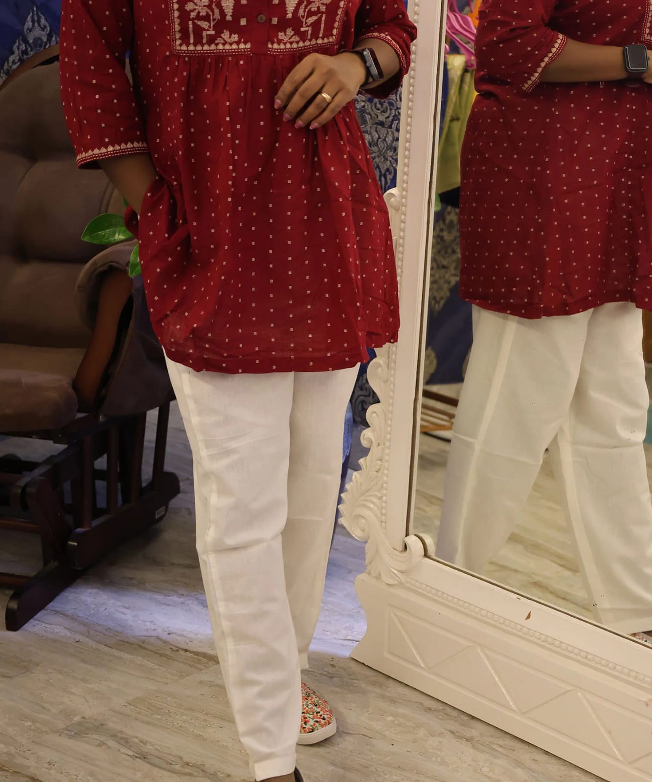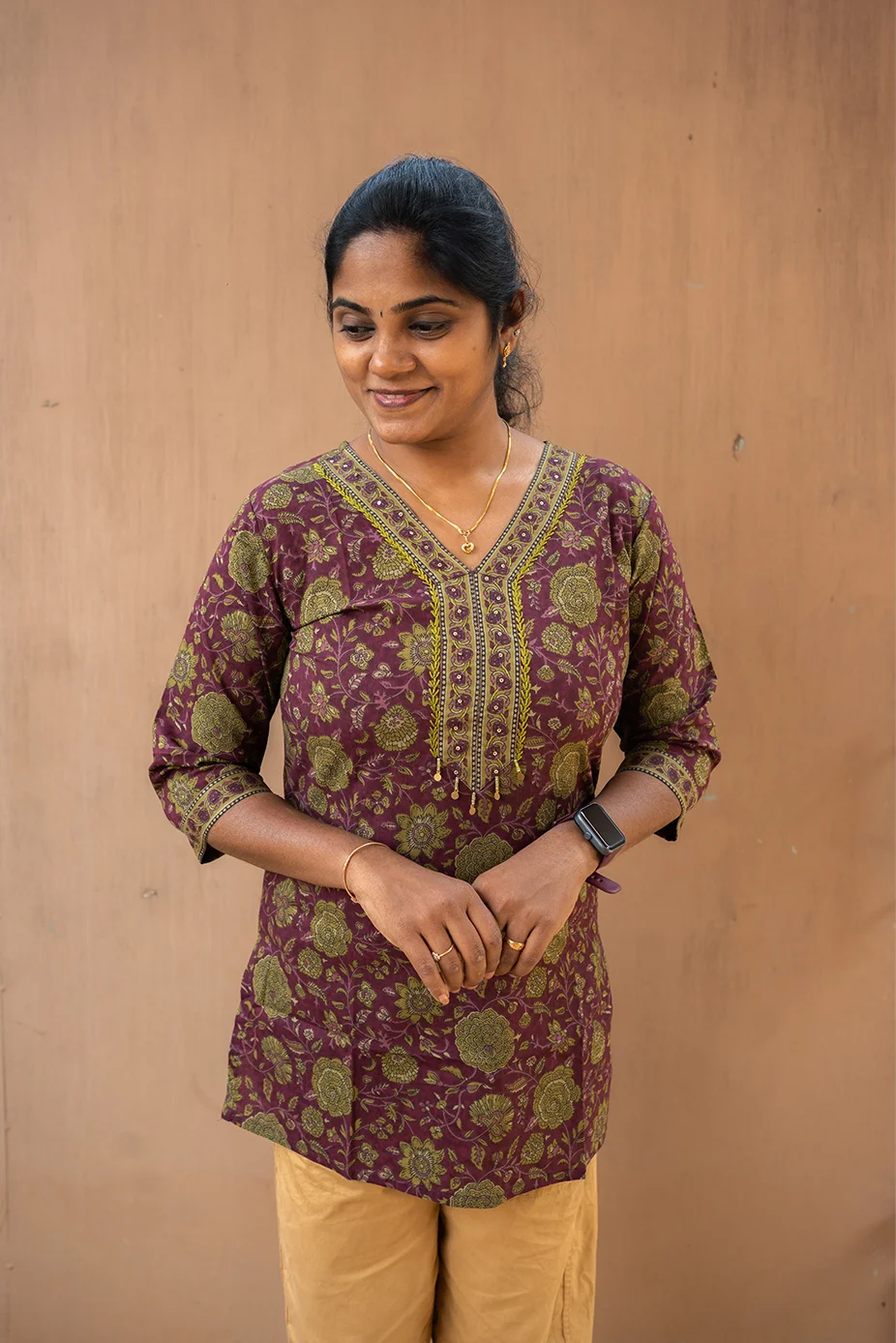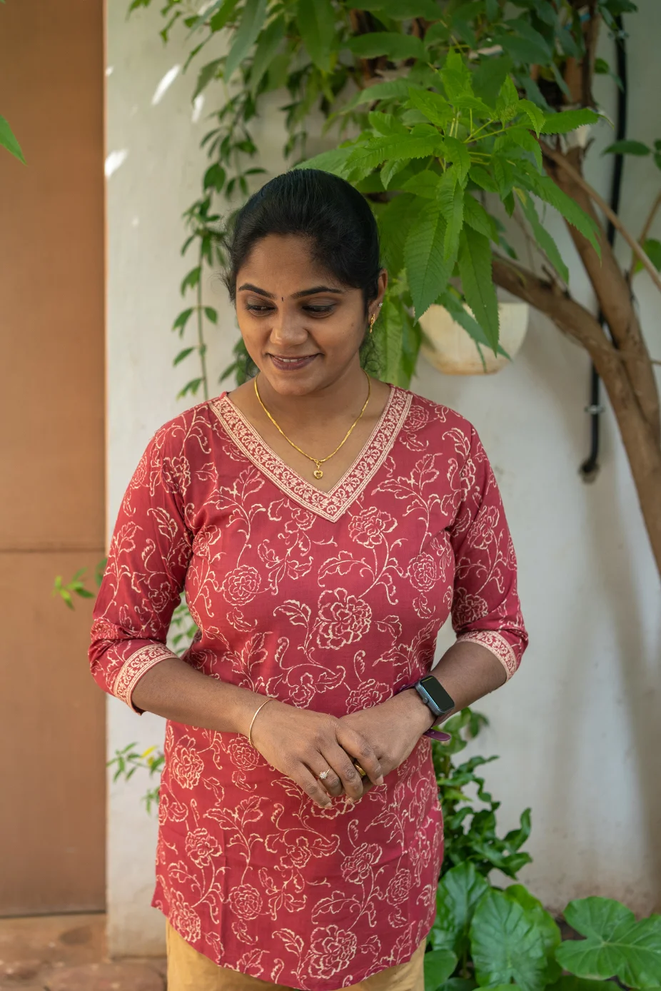 Cotton Straight V Neck Sequence Border Short Top Maroon
