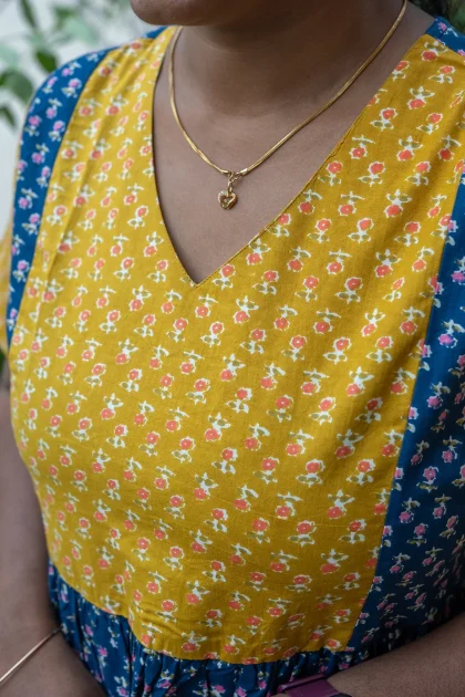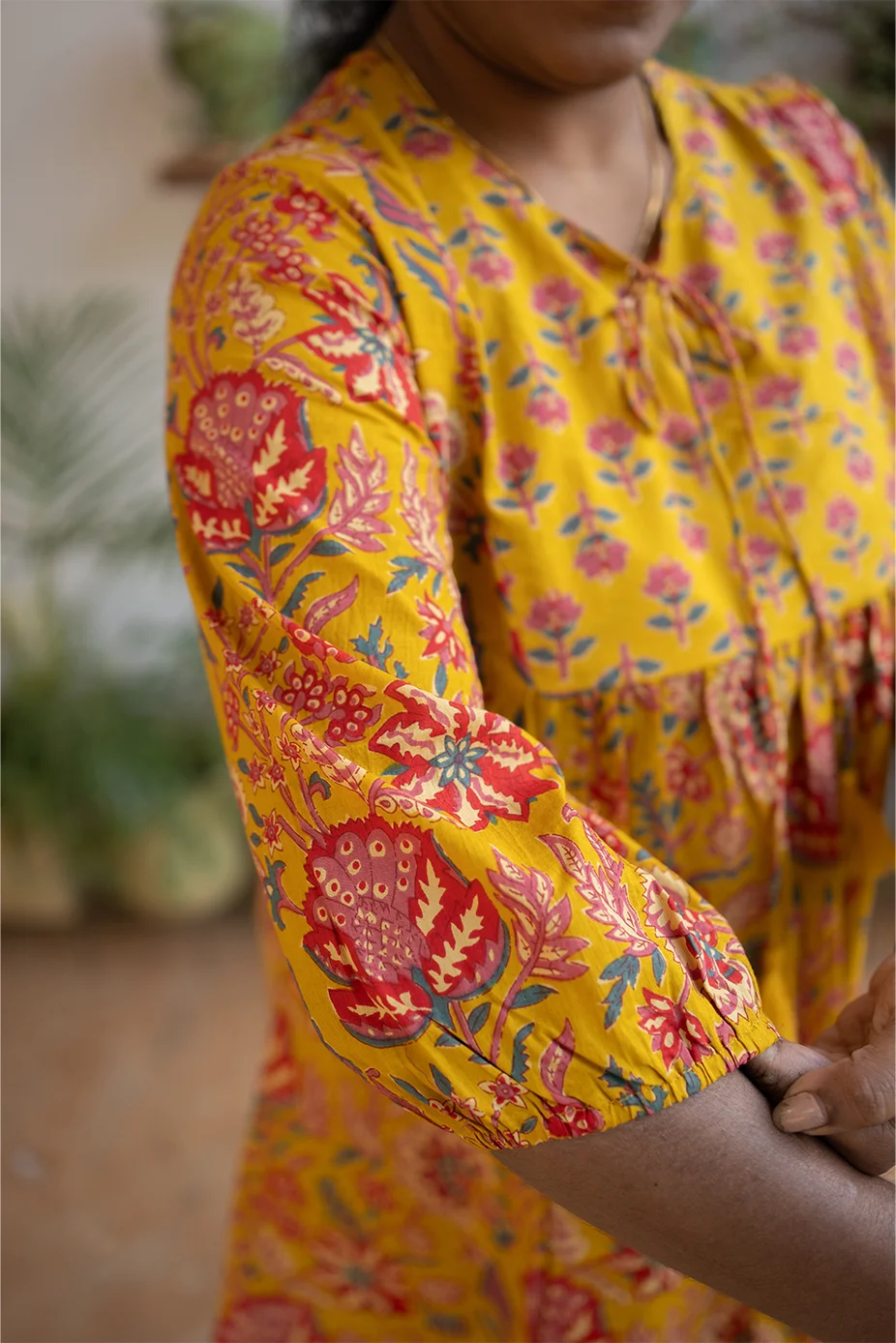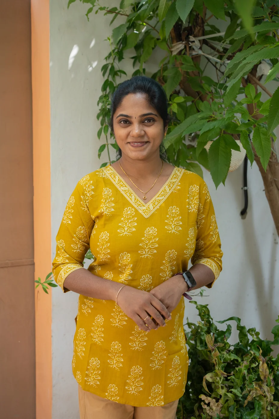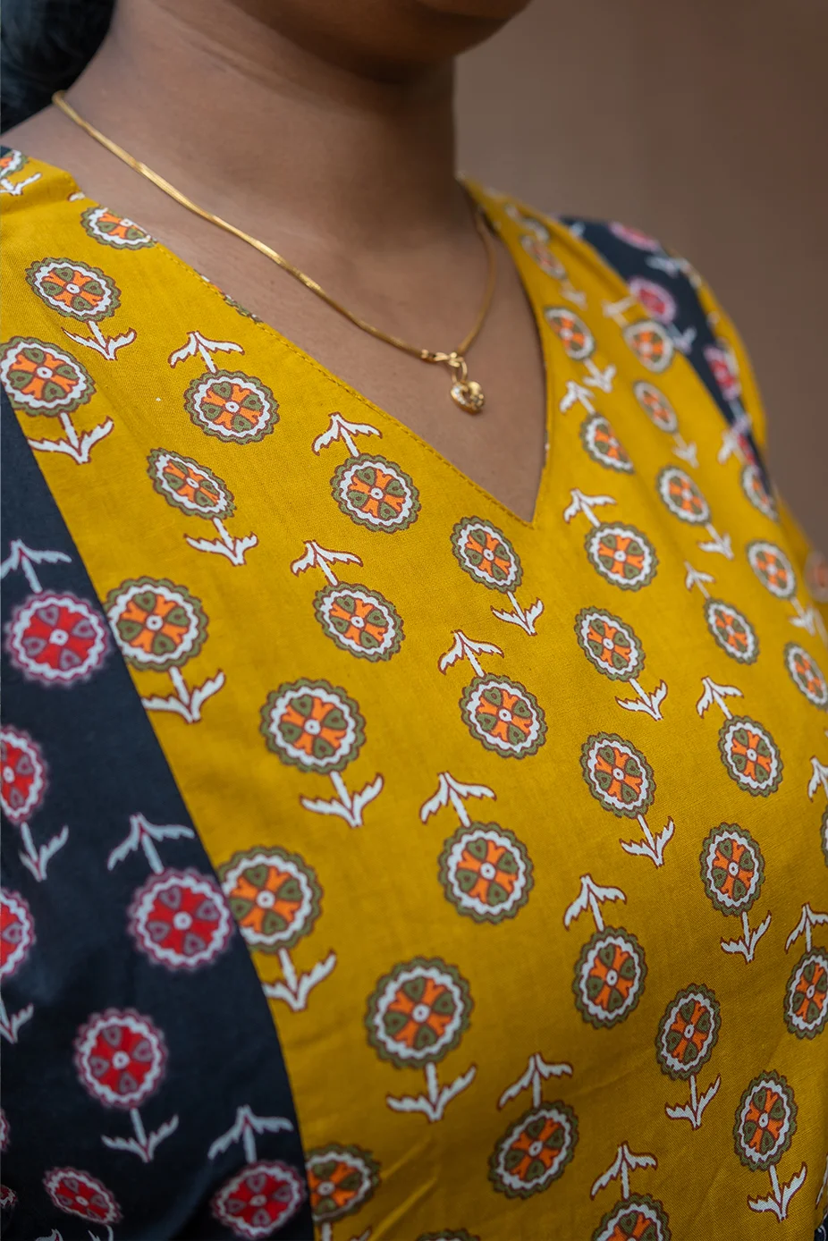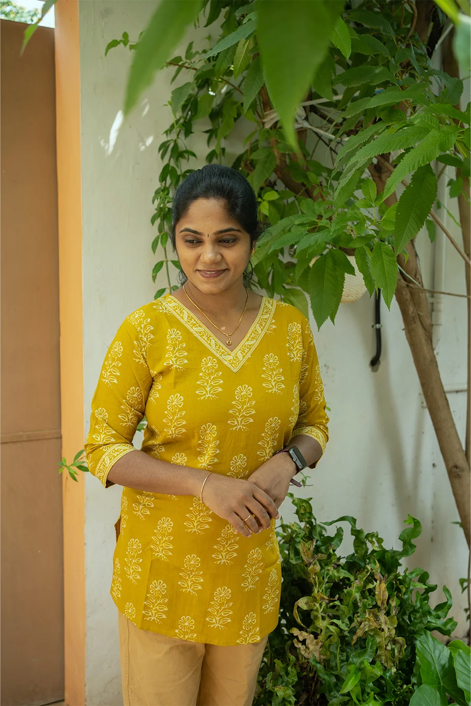 Cotton Round Neck A Line Yoke Short Top Mustard Yellow