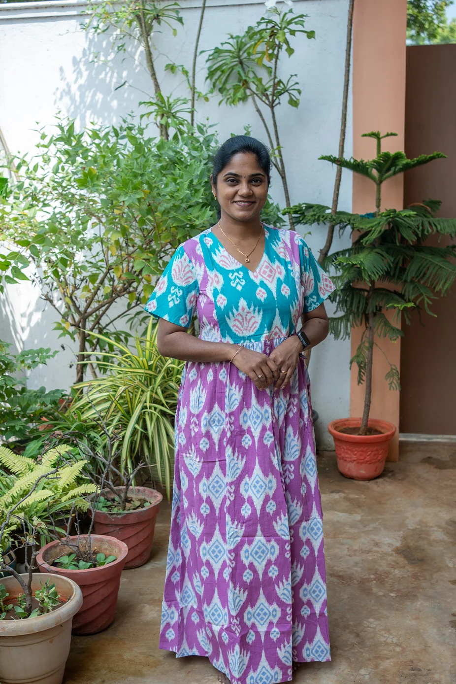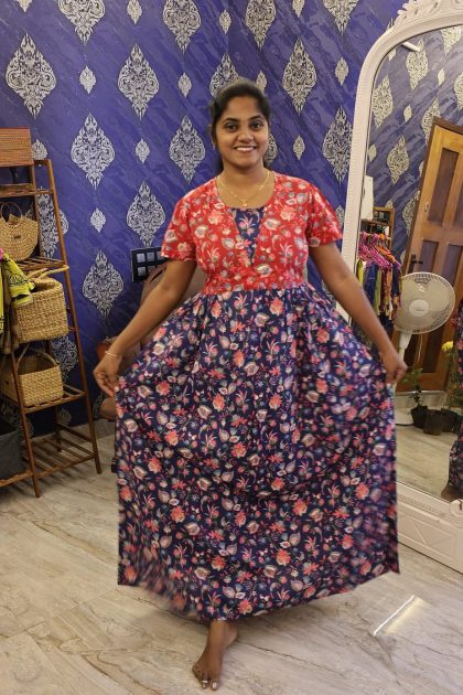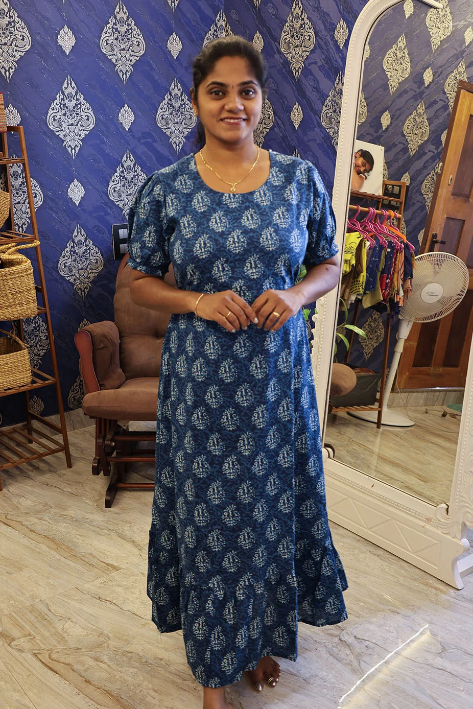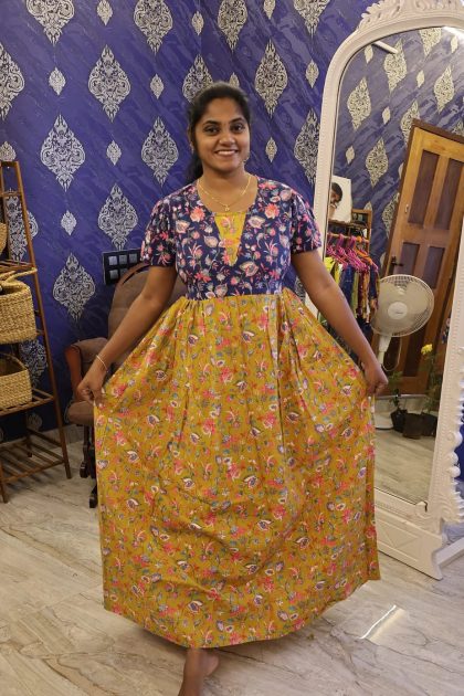 Cotton Nighty Non Feeding Navy Blue with Mustard Yellow
