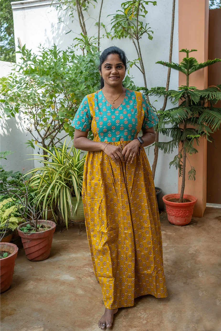 Cotton Nighty Non Feeding Mustard Yellow with Mint Green