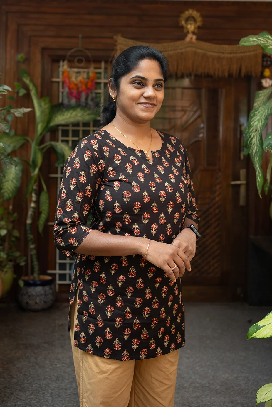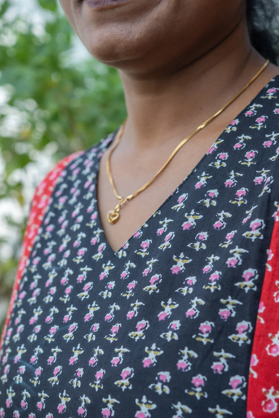 Cotton Straight V Neck Sequence Border Short Top Black Floral