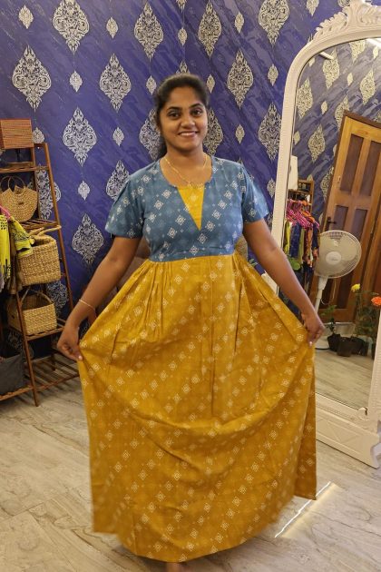 CottonStylish Nighty Mustard Yellow With Teal Blue