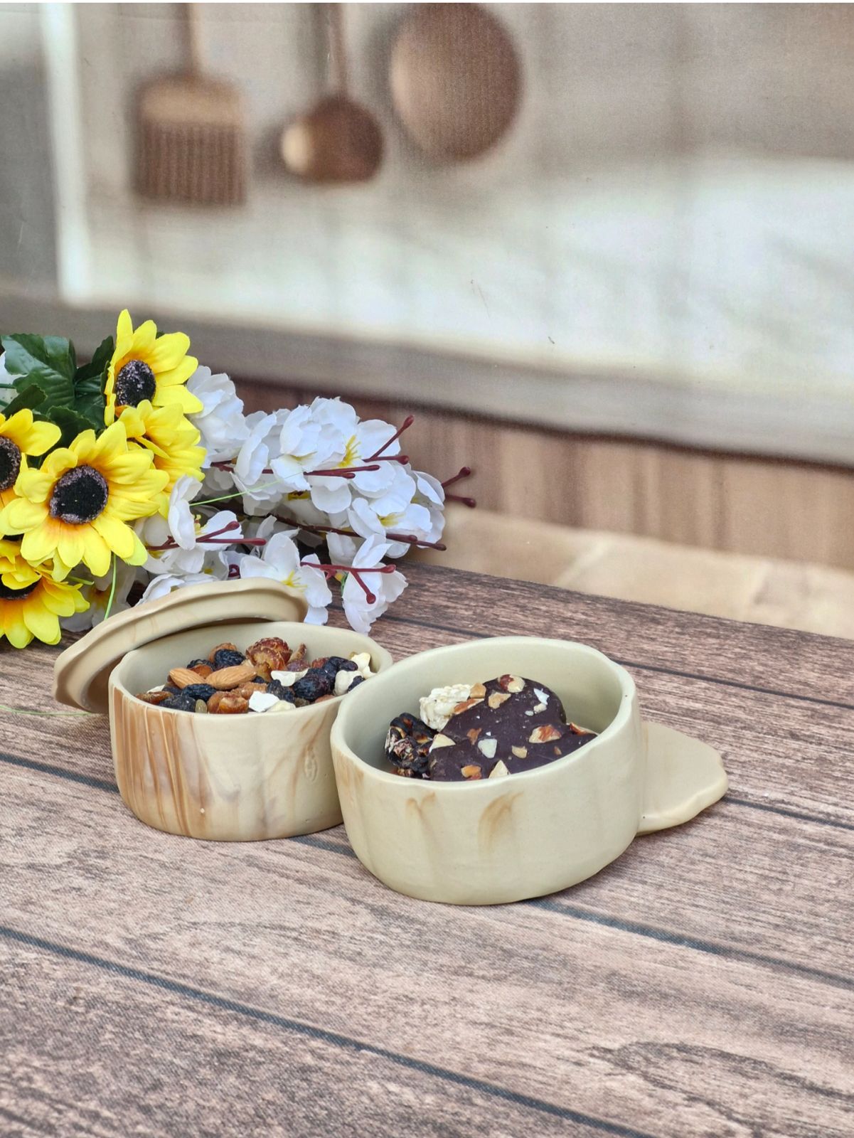 Perfect for storing nuts, dried fruits, or your favorite treats, the ceramic jars add a calm, natural aesthetic to your kitchen, workspace, or coffee table. The energy bites are made for on-the-go moments—rich in texture, naturally satisfying, and ideal when you need a quick pick-me-up.