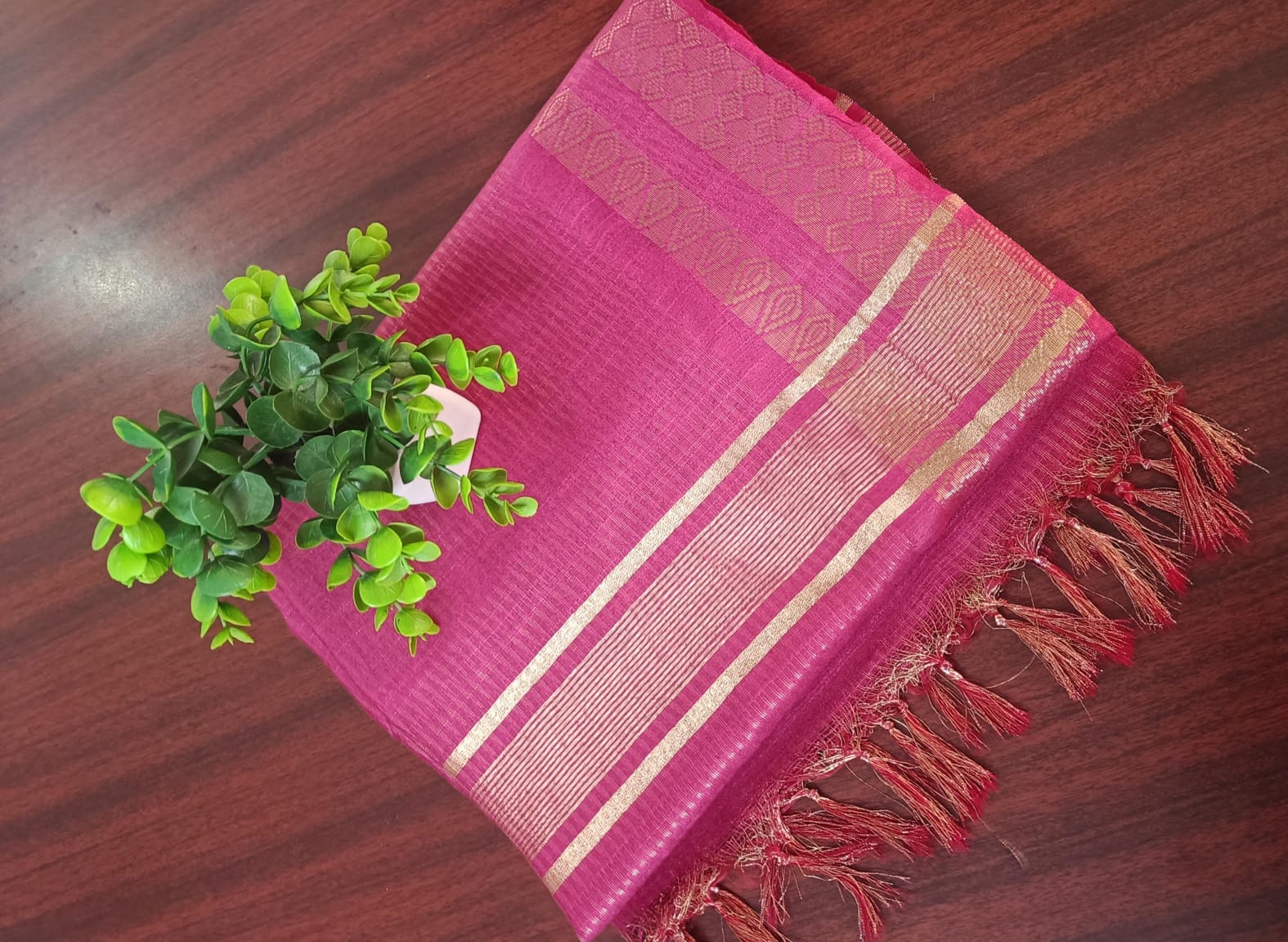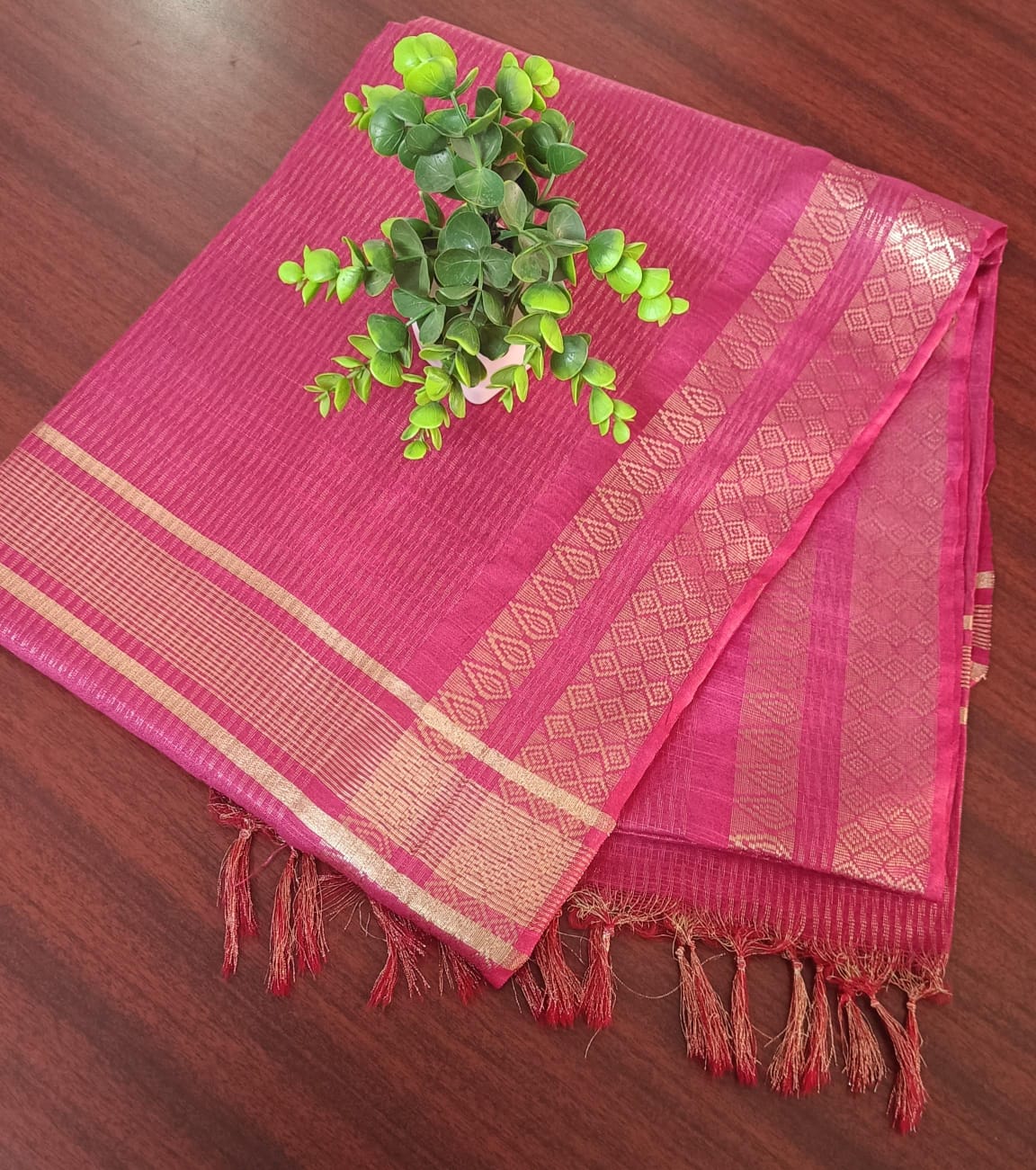The fabric has a unique natural glow that enhances the richness of the saree without being overly glossy.